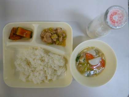 今日の献立は、鶏肉としろねぎのいため煮、のっぺい汁、焼きかぼちゃのごまだれかけ、ごはん、牛乳でした。