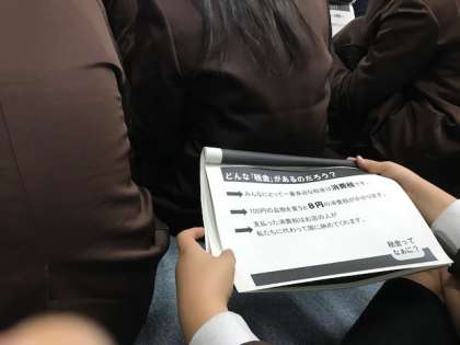 はじめに、DVDを視聴し、「税金はなぜ必要なのか」「どんな税金があってどのように使われているのか」などを学習しました。DVDを通して学習した後は、クイズを通して、ほとんどの施設で税が使われていることを知り、税の大切さを学びました。