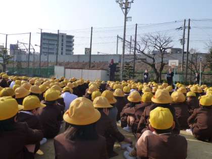 避難の時の約束事、「お・は・し・も」「押さない・走らない・しゃべらない・戻らない」を徹底し、運動場に避難します。