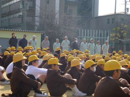 今日の土曜授業では、地域防災リーダーさんたち駆けつけてくださり、地震・津波を想定した避難訓練を行いました。