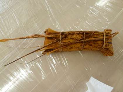 ご近所の「千成寿司」さん指導のもと、25組の親子が巻きずしづくりにチャレンジです。手本を見て、説明を聞くと簡単そうに思えますが、いざやってみるとなかなか大変です。「シャリがうまく広がらない!」「形がきれいにならない!!」などと言いながらも、和気あいあいと作業は進み、最後には、ジャーン!!竹皮で包まれ、お店で売っているような姿になりました。