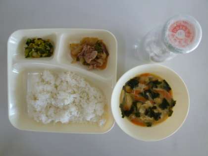 今日の献立は、豚肉のごまだれやき、みそ汁、菊菜と白菜のおひたし、ごはん、牛乳でした。