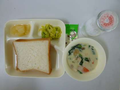 今日の献立は、ほうれん草のクリームシチュー、キャベツのサラダ、洋なし(カット缶)、食パン、マーガリン、牛乳でした。