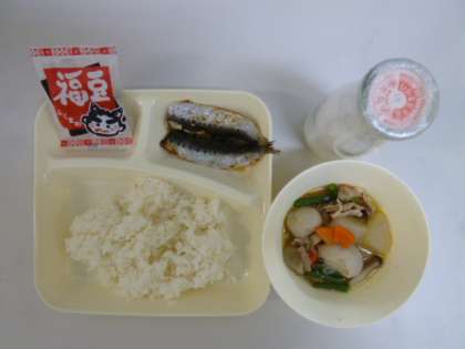 今日の献立は、いわしのしょうがじょうゆかけ、含め煮、いり大豆、ごはん、牛乳でした。