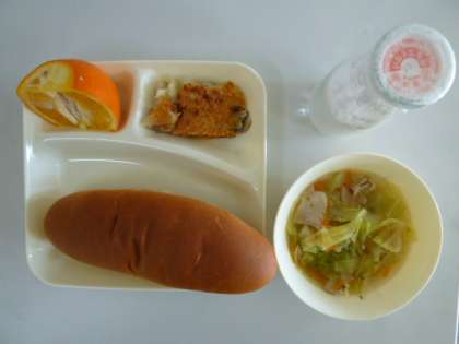 今日の献立は、押し麦のグラタン、スープ、いよかん、黒糖パン、牛乳でした。
