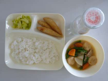 今日の献立は、わかさぎフライ(新食品)、一口がんもとじゃがいもの煮物、あっさりキャベツ、ごはん、牛乳でした。