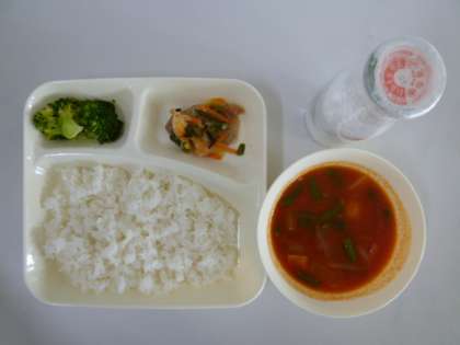 今日の献立は、鶏肉とチーズのカラフル焼き、野菜のミネストローネ、ブロッコリーのサラダ、ごはん、牛乳でした。