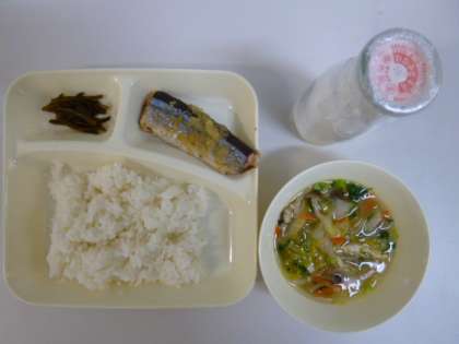 今日の献立は、さんまのみぞれかけ、五目汁、茎わかめのつくだ煮、ごはん、牛乳でした。