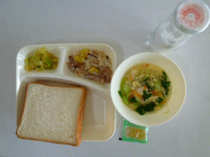 今日の献立は、中華おこわ、たまごスープ、キャベツのオイスターソースいため、食パン、りんごジャム、牛乳でした。