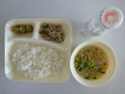 今日の献立は、豚肉と野菜のいためもの、すまし汁、きなこよもぎだんご、ごはん、牛乳でした。