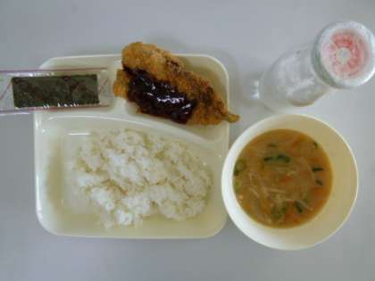 今日の献立は、いわしのフライ、みそ汁、やきのり、ごはん、牛乳でした。