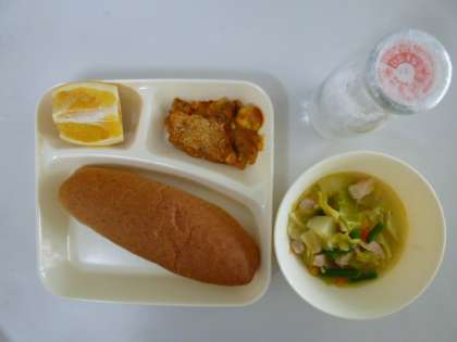 今日の献立は、とうふのミートグラタン、スープ煮、はっさく、ライ麦パン、牛乳でした。