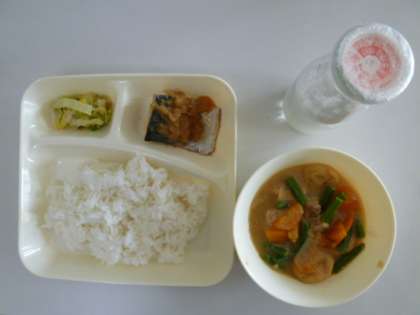 今日の献立は、さばのおろしじょうゆかけ、一口がんもと里芋のみそ煮、白菜のごまあえ、ごはん、牛乳でした。