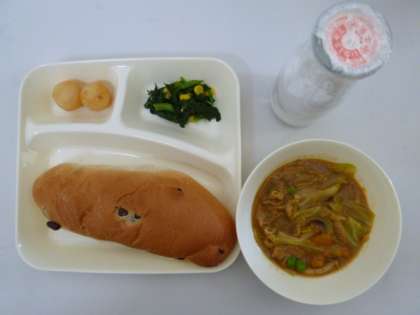 今日の献立は、豚肉と野菜のカレー煮、ほうれん草のソテー、あげポテトもち、レーズンパン、牛乳でした。