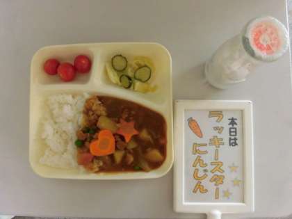 今日の献立は、チキンカレーライス、キャベツときゅうりのサラダ、プチトマト、牛乳でした。
