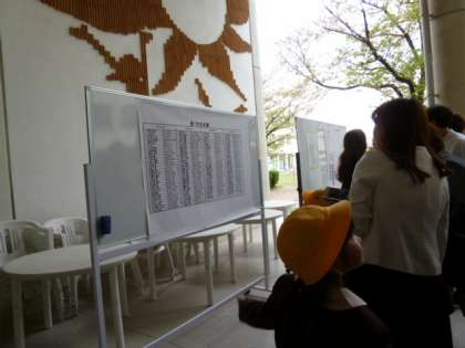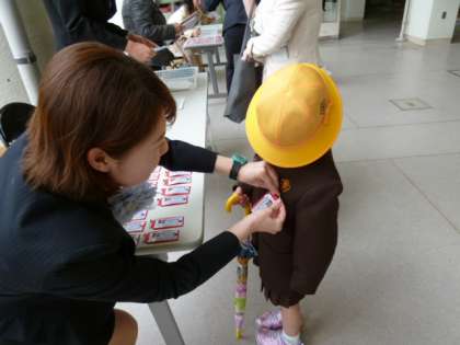 まずは玄関で記念撮影。「何組になったのかなあ?」と確認した後は、真新しい名札をつけてもらいました。