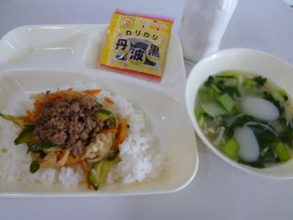 給食のビビンバは、肉と野菜の具を別々で炒めて作ってごはんと一緒に盛り付け、よく混ぜて食べます。