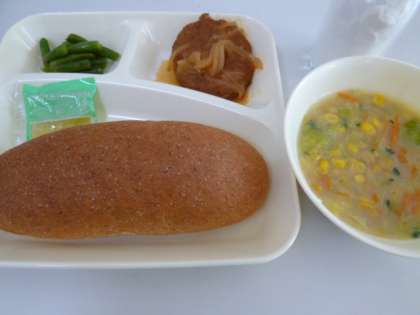 今日の献立はライ麦パン、牛乳、コーンスープ、煮込みハンバーグ、コーンスープ、三度豆のサラダ、リンゴジャムでした。