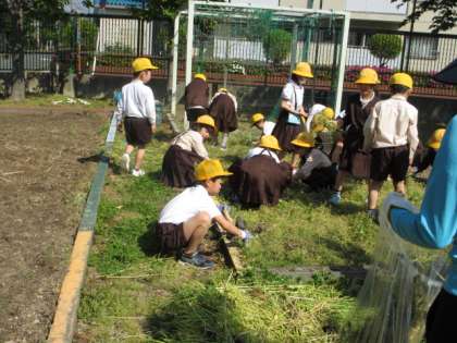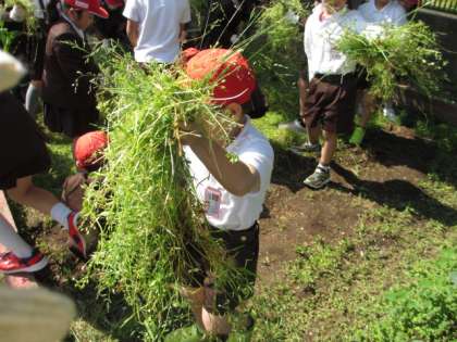 朝の涼しい時間の間に、学習園の草抜きをしました。