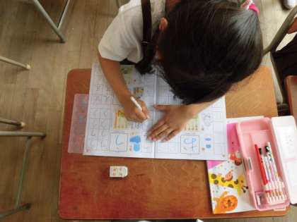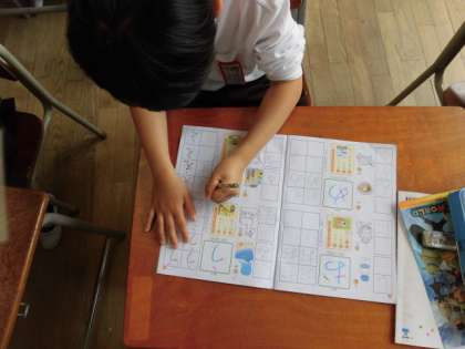 国語の授業では、ひらがなを書く練習をしています。みんな丁寧に書こうと一生懸命に練習しています。はじめは「難しい!!」という声も多くありましたが、だんだん「きれいに書けた!!」「頑張って書いたよ」という声も出てきました。
