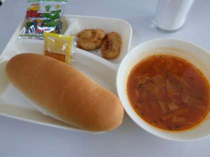 今日の献立は、コッペパン、牛乳、一口トンカツ、ミネストローネ、豆こんぶ、アプリコットジャムでした。