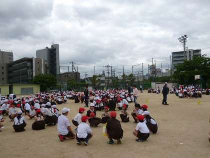 その後、運動場へ出て、集会委員会によるゲームを楽しみました。円になって、「ゴロゴロゴロ・・・」の間はボールを右へ回し、「ピカピカピカ・・・」の間は左へ回し、「ドン!」のときにボールを持っていた子が、好きなものを発表します。