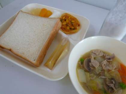 今日の献立は、食パン、牛乳、豚肉と野菜のスープ煮、変わりピザ、ミックスフルーツ(缶)でした。