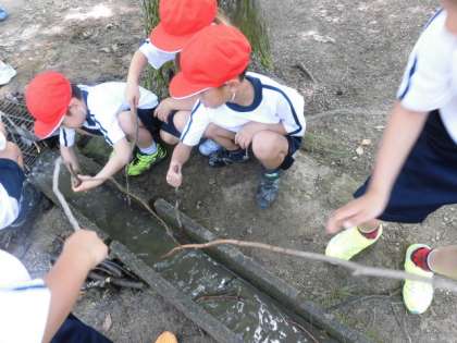 午後の遊びでは、水が流れているところで釣りのまねをしたり、どんぐりを拾ったり自然に触れて遊ぶ姿が多く見られました。保育園の子どもたちとも仲良く遊んでいました。