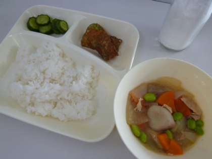 今日の献立は、ごはん、牛乳、ちくわのいそべあげ、鶏肉とさといもの煮物、あっさりきゅうりでした。