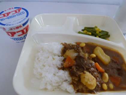 今日の献立は、ごはん、牛乳、牛肉と大豆のカレーライス、三度豆とコーンのサラダ