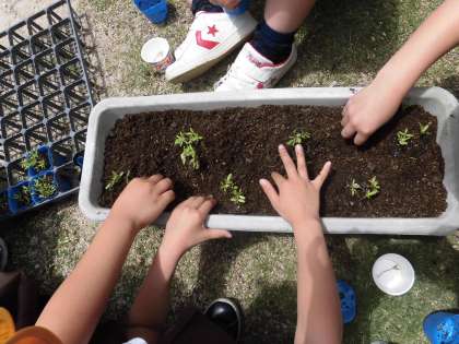 三年生は理科の授業でホウセンカとマリーゴルドを育てています。四月から大事に育ててきた苗が大きく成長したので、プランターと畑に植え替えました。これから暑くなってきますが、すくすくと育ってほしいです。