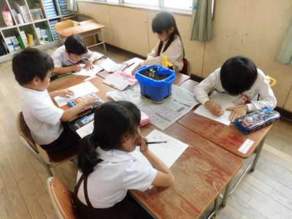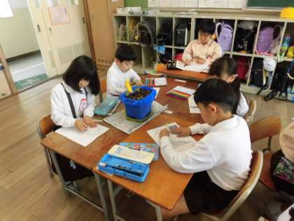 あさがおの種から早くも芽がでてきました。生活科では、その芽を観察しました。「ちょうちょみたい」とみんな思い思いにわかったことを発表してくれました。