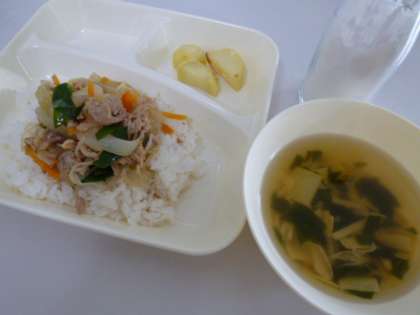 今日の献立は、ごはん、牛乳、豚丼、湯葉のすまし汁、焼きじゃがでした。