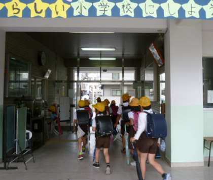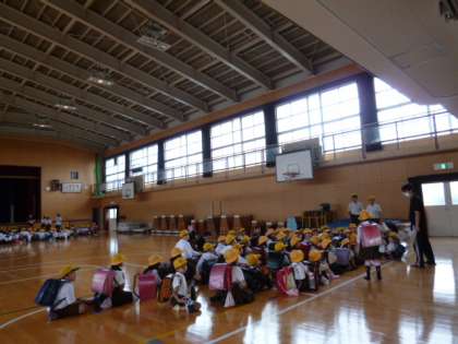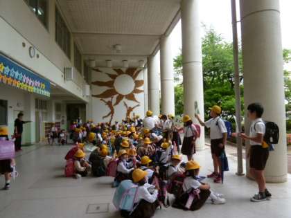 まずは分団長がピロティでプラカードを掲げ、1年生を各分団の教室へ連れて行きます。