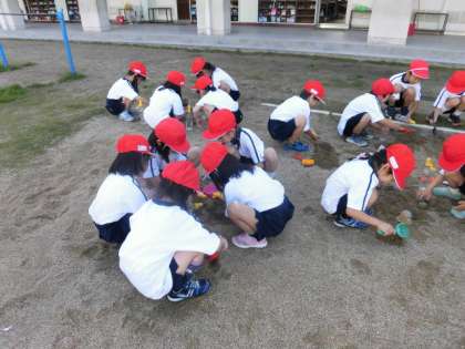 生活科の時間にすなあそびをしました。みんなとても楽しみにしており、朝からとてもわくわくしていました。スコップやカップを使って、山や川を一生懸命に作っていました。友だちに「一緒に作ろう!!」と声をかけて仲良く遊ぶことができました。