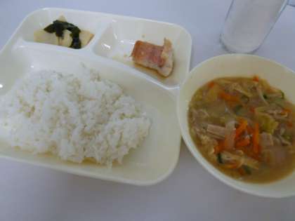 今日の献立は、ごはん、牛乳、赤魚のしょうゆだれかけ、みそ汁、わかたけ煮でした。