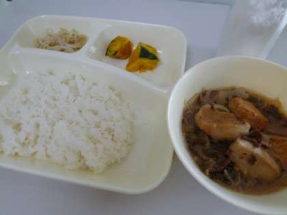 今日の献立は、ごはん、牛乳、すき焼き煮、焼きかぼちゃの甘みつかけ、もやしのごま酢あえでした。」