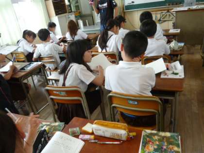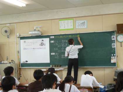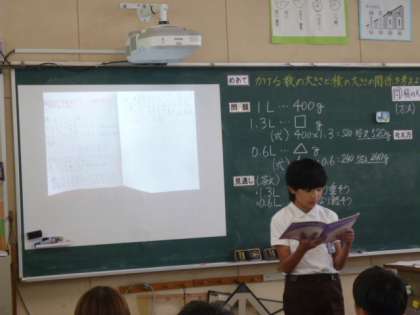 子どもたちは自分の考えをノートにまとめたり、隣同志で考えを交流したり、スクリーンにノートを投影して考えを発表したり。意欲的に学習に取り組んでいました。