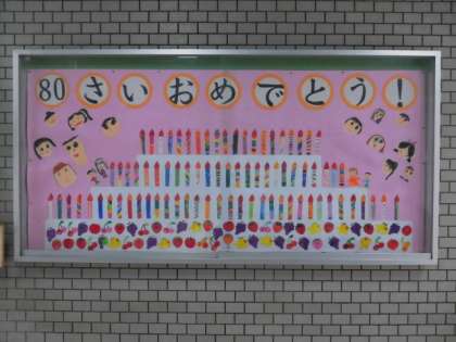 6月の玄関掲示は1年生が担当しました。菅原小学校が80歳を迎えるということで、大きなバースデイケーキを作りました。1年生たちが一生懸命パスでぬりました。ろうそくも80本あります。学校へ来た時には、ぜひ足を止めてご覧ください。