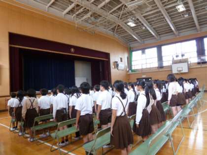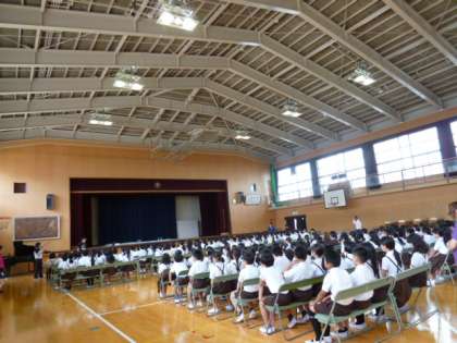 式典の後半、6年生が「よろこびの言葉」を述べ、5,6年生一緒に「この星にうまれて」を合唱します。