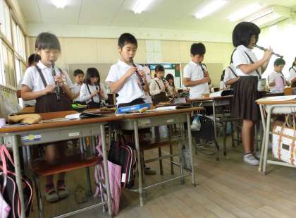 リコーダーを習いたてである三年生は、「シ」と「ド」が連続した指づかいが難しく、何度も何度も失敗と練習を繰り返して、ようやくできるようになってきました。子どもたちの「できた!」という喜びの気持ちを大切に、日々の指導に取り組んでいきたいと思っています。