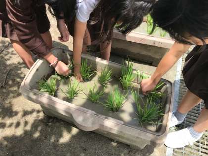 昨日と本日、1学期最後の稲作を行いました。今回は、苗をプランター(田んぼ)に植え替える田植えです。