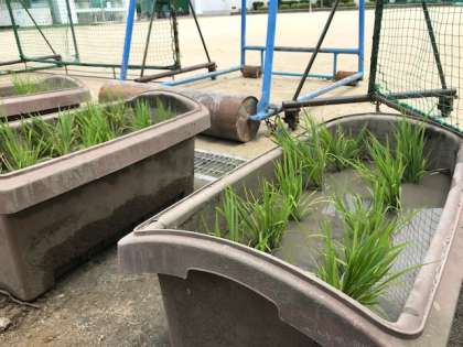 稲作は今年初めての取り組みとなり、一からのスタートで、子ども達はずいぶん苦労しました(先生も…)。あとは、無事育つのを祈るのみです。2学期の調理実習で、自分達で収穫したお米がたくさん食べられるといいですね。