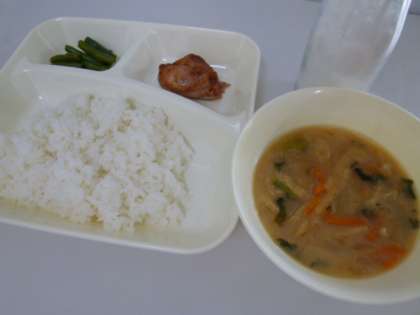 今日の献立は、ごはん、牛乳、鶏肉のしょうゆバター焼き、みそ汁、三度豆のからしじょうゆあえでした。