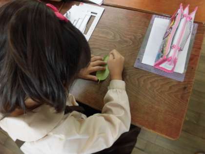 まず、葉書という漢字の由来となったタラヨウ(郵便局のシンボルツリー)の葉のに、つまようじで文字を書きました。次第に葉に文字が浮かび上がってくるのを見て、子どもたちは興味津々の様子でした。