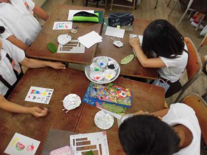 次に、絵葉書を作る活動をしました。葉書を送る相手への気持ちを大切に込めて、子どもたちはがんばって絵を描きました。