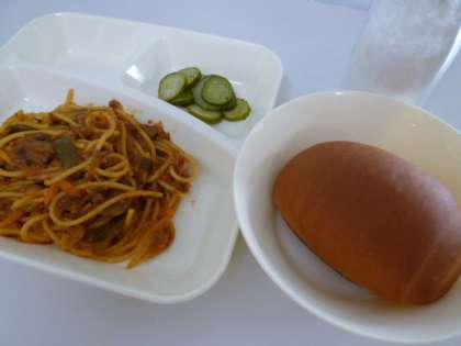 今日の献立は、黒糖パン、牛乳、スパゲッティミートソース、きゅうりのバジル風味サラダでした。