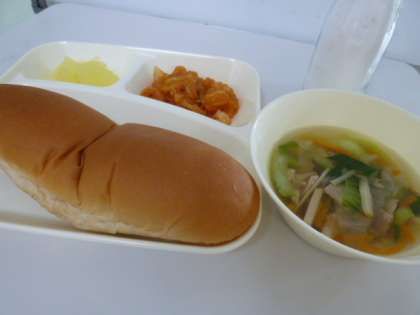 今日の献立は、黒糖パン、牛乳、えびのチリソース、中華スープ、りんご(缶)