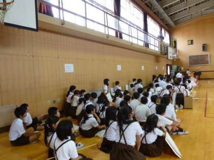 それぞれの学級が、自分たちで考えたゲームのルールを堂々と発表し、きょうだい班では、発表を聞いて、お店めぐりの計画を立てていました。