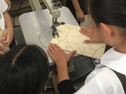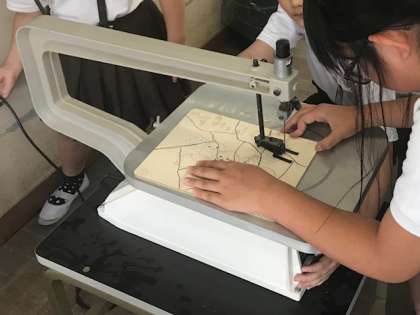 5年生は、電動のこぎりを使って木工パズルを制作しています。安全に電のこを活用する方法をしっかりと聞いて、それを実践しながら器用に切っていました。本校の電のこは、スピード調節ができるタイプのもので、慣れてきた子は低速から高速へ切り替えて職人のような手つきでカーブを描いていました。